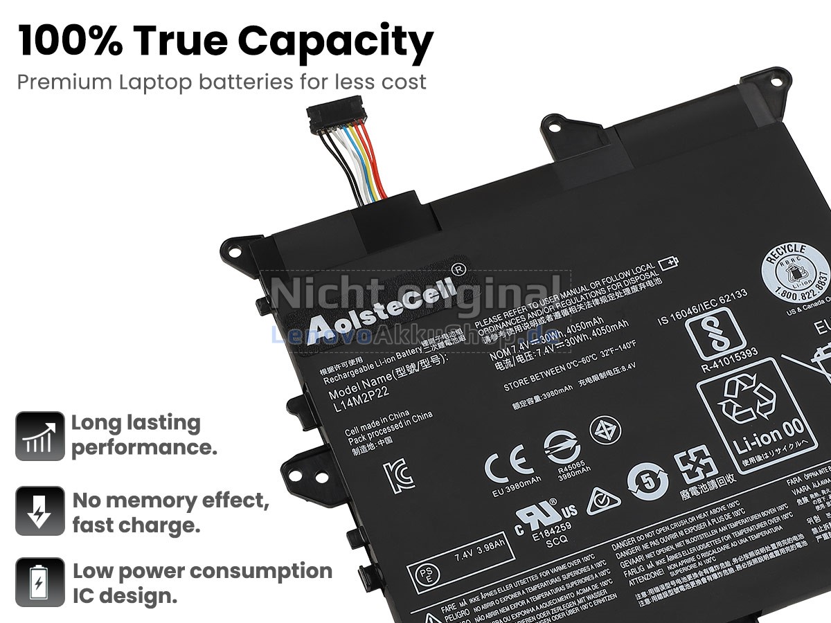 Unser Lenovo FLEX 3-1120 Ersatzakku hat auch eine Reihe von Sicherheitszertifizierungen wie GS, CE, UL, RoHS und ISO9001:2015 bestanden. Darüber hinaus werden alle FLEX 3-1120 Akkus vor Warenausgang mehr als 100 strengen Tests unterzogen. Nur um Ihre Verwendung komfortabler zu gestalten!