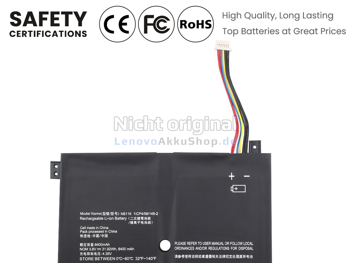 Unser Lenovo NB116(1ICP4/58/145-2) Ersatzakku hat auch eine Reihe von Sicherheitszertifizierungen wie GS, CE, UL, RoHS und ISO9001:2015 bestanden. Darüber hinaus werden alle NB116(1ICP4/58/145-2) Akkus vor Warenausgang mehr als 100 strengen Tests unterzogen. Nur um Ihre Verwendung komfortabler zu gestalten!