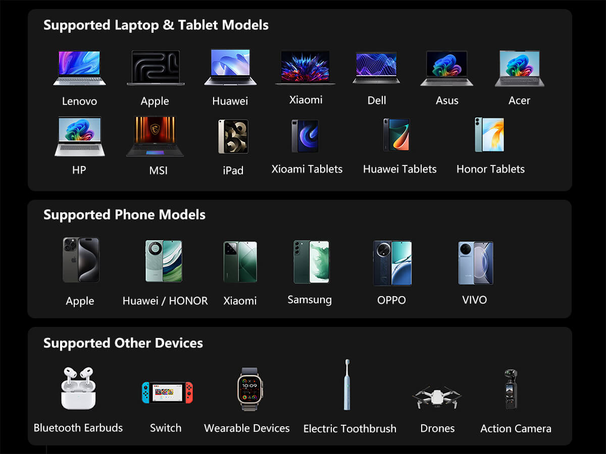 Ein digitales Display zeigt den aktuellen Akkustand präzise an. Die Powerbank ist kompatibel mit Laptops, Smartphones, Bluetooth-Kopfhörern, Smartwatches, Drohnen, Action-Kameras und Handheld-Konsolen. Dank CE-, FCC-, RoHS-Zertifizierung und bestandener UN38.3-Prüfung ist sie für Flugreisen zugelassen und ideal für internationale Einsätze.